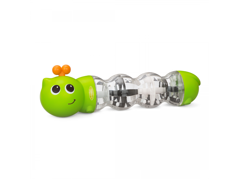 Hračka v tvare usmievavej húsenice je naplnená guličkami, ktoré pri pohybe jemne hrkajú.