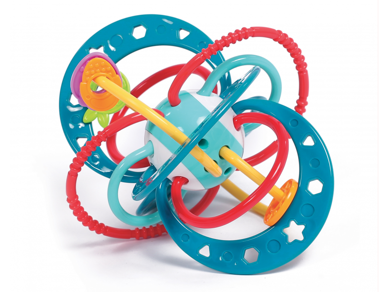Unikátna hrkálka z pružného materiálu ponúka mnoho možností na uchopenie a skúmanie. Pozornosť dieťaťa upútajú výrazné farby, rôznorodé textúry aj pohyblivé korálky. Najmenšie deti hrkálku budú skúmať rukami aj ústami, hrkálka môže slúžiť aj ako hryzátko na masírovanie ďasien pri prerezávaní prvých zúbkov. Staršie deti si môžu cvičiť svoj postreh hádzaním a chytaním hračky namiesto loptičky.