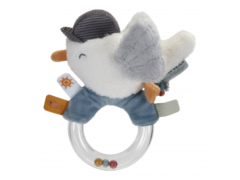 Originálna hrkálka v podobe priehľadného krúžku s hrkajúcimi korálkami a plyšovej čajky z kolekcie Námornícky záliv je ideálna ako prvá hračka pre vaše bábätko. Hrkálka má tvar pre ľahké uchopenie a rôznorodé textúry na skúmanie rukami i ústami. Krídla čajky pri stlačení šuštia.