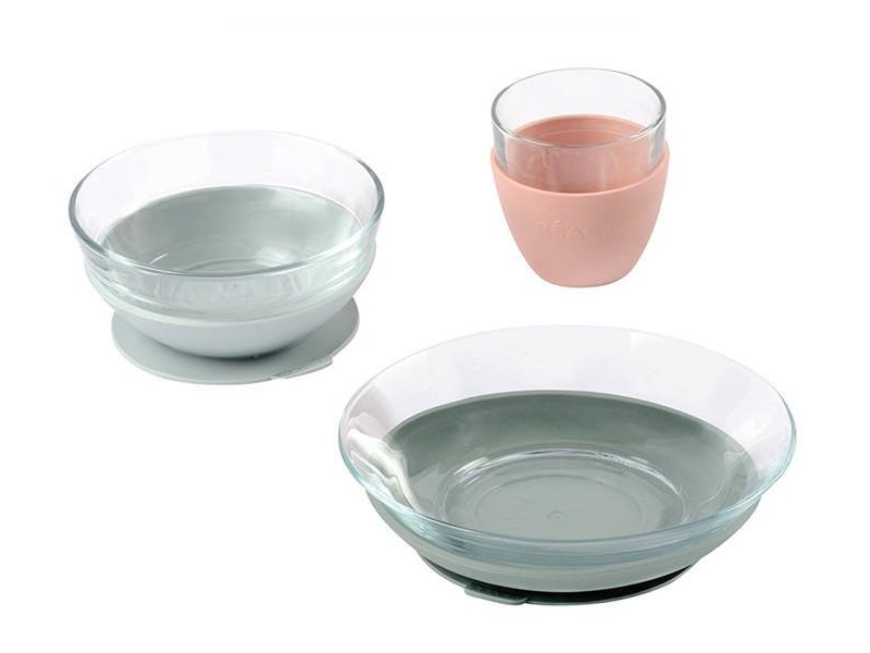 Unikátny sadu riadu z tvrdeného skla tvorí jedálenska miska, tanierik a pohárik ergonomického, zaobleného tvaru s hladkými hranami. Miska a tanier sú doplnené špeciálnymi odnímateľnými podložkami z pružného materiálu s prísavkou, ktorá zaisťuje stabilitu misky či taniera na stole a uľahčuje dieťaťu stolovanie. Návlek na pohárik z rovnakého materiálu uľahčuje dieťaťu uchopenie poháre a znižuje riziko jej vykĺznutiu z ruky.