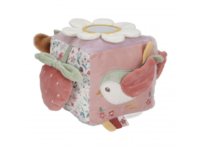 Mäkká plyšová kocka s krásnymi motívmi zo života na záhrade je vďaka svojmu prevedeniu ľahko uchopiteľná malými detskými ručičkami. Rôznorodé textúry, pripevnené hračky a vyšívané ilustrácie lákajú dieťa na skúmanie, kocka navyše pri pohybe jemne cinká.