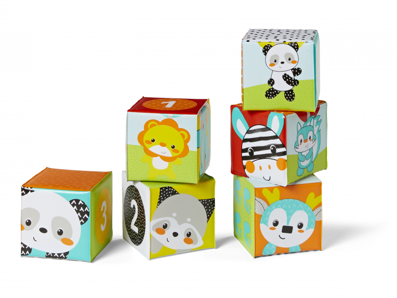 Umývateľné kocky s krásnymi ilustráciami zvieratiek vo výrazných kontrastných farbách sú vhodné pre použitie vo vani aj ako prvé kocky na stavanie veží a spoločné rozprávanie o zvieratkách, farbách i číslach.