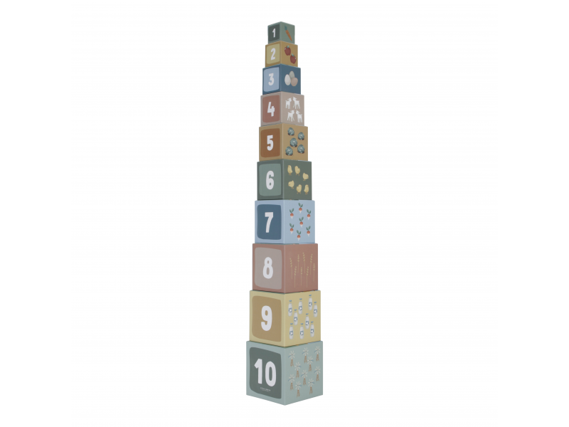 Farebné kartónové kocky s krásnymi ilustráciami motivov zo života na farme. Nechajte vaše dieťa kocky skladať na seba do vysokej veže alebo vedľa seba podľa veľkosti. V staršom veku sa dieťa s pomocou očíslovaných kociek môže hravým spôsobom učiť počítať aj rozpoznávať číslice.