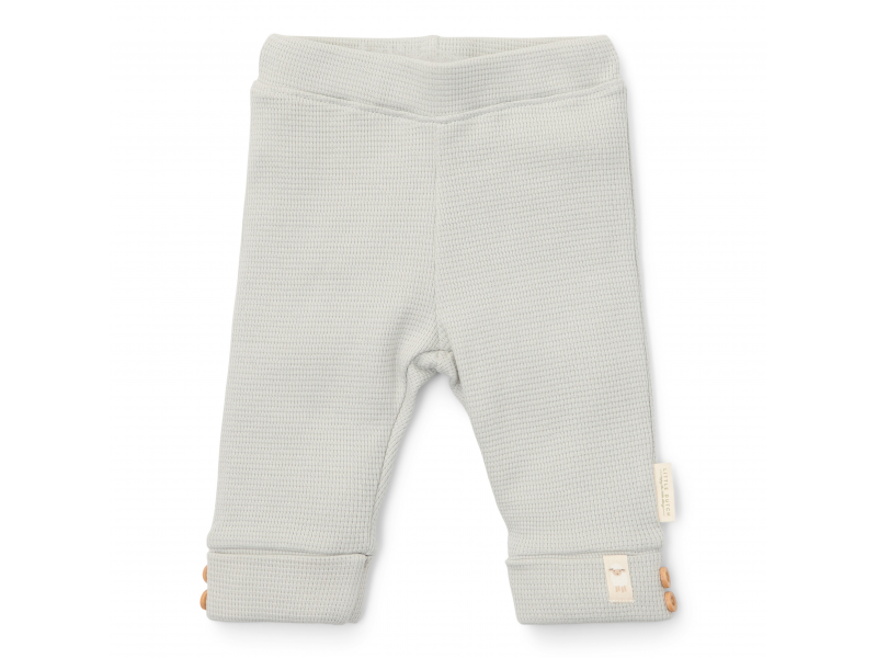 Nohavice z mäkkej organickej bavlny majú pružný pás pre pohodlie dieťaťa a dekoratívne drevené gombíky na vyhrnutých manžetách nohavíc.