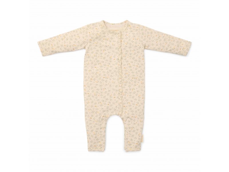 Overal na spanie z mäkkej organickej bavlny s jemnou potlačou má zapínanie na patentky na prednej strane av rozkroku pre ľahké obliekanie aj prebaľovanie dieťaťa.
