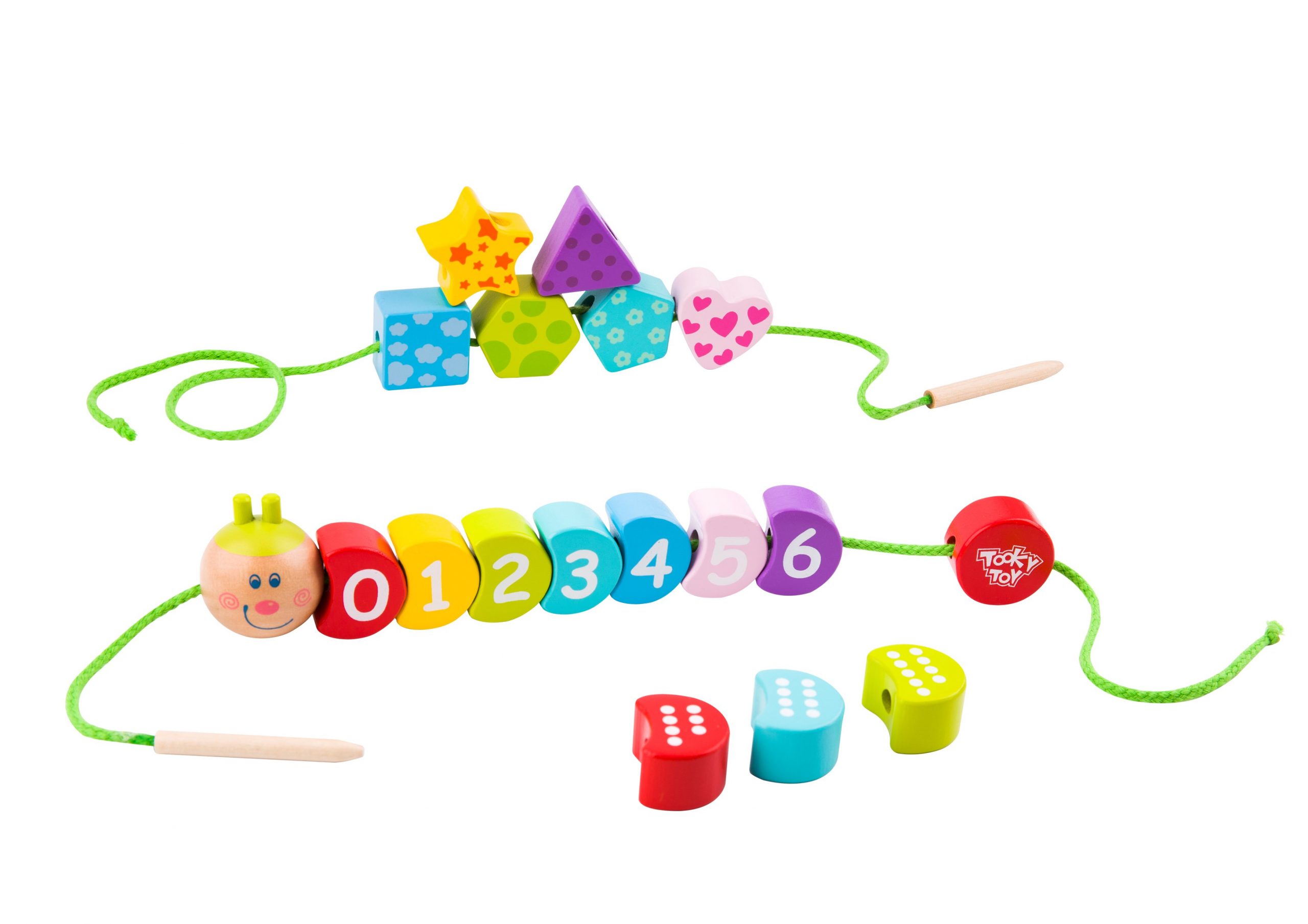 Prevliekanie Húsenica s Číslami Motorická hračka založená na prevliekanie korálkov cez otvory Rôzne tvarované korálky dobre padnú do detskej rúčky. Hračka rozvíja a precvičuje jemnú motoriku, trpezlivosť a koncentráciu u detí.Deti sa učia počítať Húsenica bude poskladaná správne len vtedy, až deti zoradia na šnúrke čísla v správnom poradí. Deti sa učia čísla hravou a nenútenou formou.