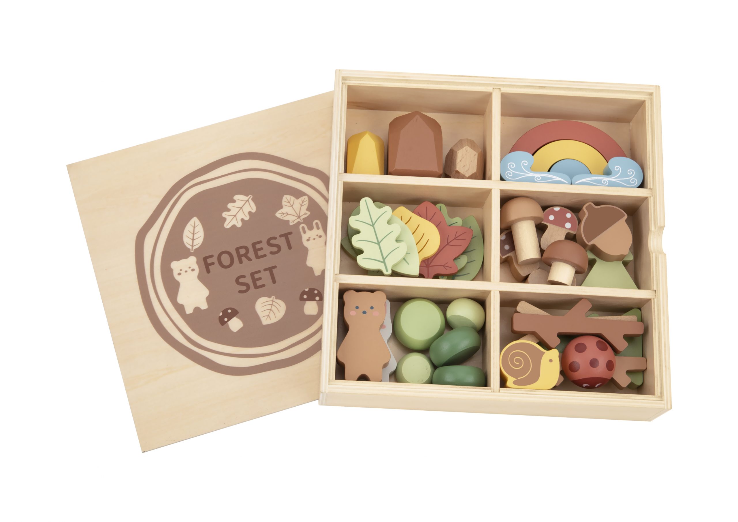 Sada na hranie v boxe LesMalý les vo veľkom boxe – dobrodružstvo, ktoré sa mieša s hranímOtvorte krabičku a vo vnútri nájdete celý les – plný zvieratiek, stromov, kameňov a lesnej atmosféry. Táto drevená sada od značky Tooky Toy umožňuje deťom vytvárať vlastné scény, príbehy a prebúdzať ich vzťah k prírode.Hrací set, ktorý rastie s dieťaťomBox obsahuje takmer 40 figúrok – lesné zvieratká, rastliny, stromy, kamene a ďalšie doplnky pre budovanie vlastného lesného sveta.Krabička slúži nielen na hranie, ale je zároveň tabuľou na kreslenie kriedou – kreatívne dvojúčelové riešenie.Hra podporuje jemnú motoriku, predstavivosť a rozvoj reči, keď dieťa opisuje, čo sa v lese deje.Vyrobené z dreva z udržateľného lesníctva, s netoxickými farbami – bezpečnosť, ktorú rodičia ocenia.Vhodné pre deti od približne 3 rokov – ideálne pre hranie jednotlivca aj v dvojici.