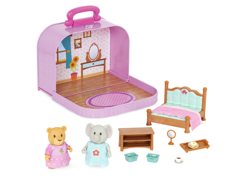 15-dielna sada obsahuje kufrík, 2 postavičky zvieratiek, posteľ, prikrývku, komodu, 2 košíky, zrkadlo, podnos, tanier, vyprážané vajcia, toast, šálku kávy a podšálku.