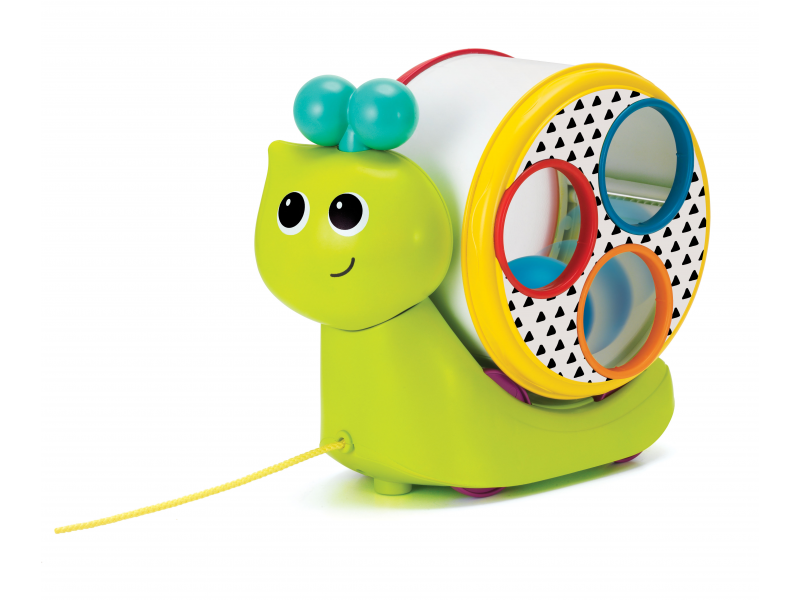 Ťahací slimák na kolieskach má odnímateľnú ulitu v tvare bubienka, naplnenú tromi loptičkami. Súčasťou je aj palička na bubienok. Hračka podporuje rozvoj zmyslov a motoriky dieťaťa.