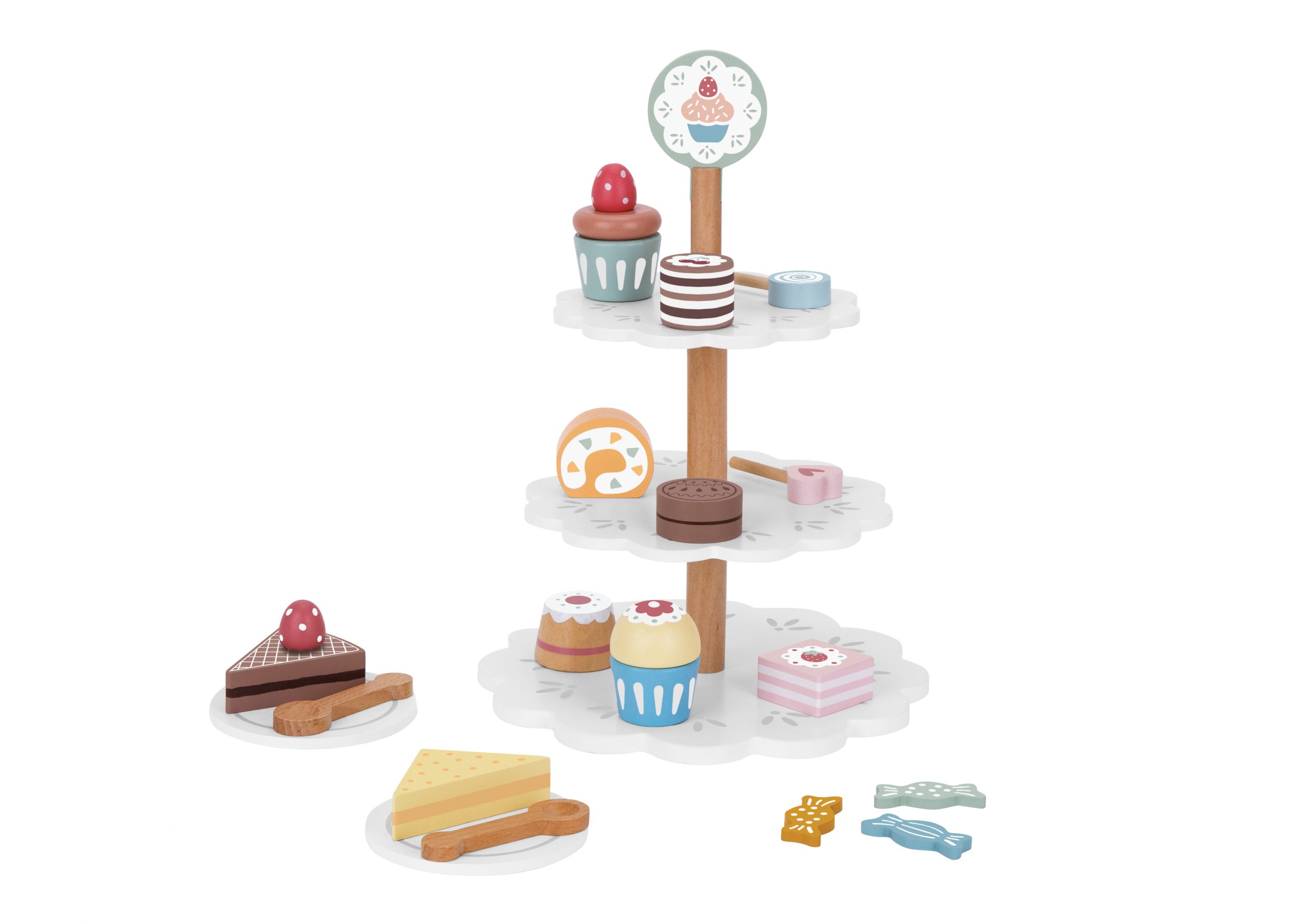 Stojan na zákusky Pastel Súprava pre malých cukrárov Neprehliadnuteľný drevený servírovací etažér na zákusky pre deti od Tooky Toy je skvelou hračkou na rolové hry na dospelých aj profesie. Pevný trojposchodový stojan (31 x 22 cm) sa stane krásnym doplnkom detskej izbičky aj detskej kuchynky. Okrem stojana vo vnútri balenia deti nájdu ďalších 18 kusov drevených tort a ďalšieho príslušenstva na servírovanie. Nechýbajú ani lyžičky a tanieriky na servírovanie.Deti si rozvíjajú sociálne zručnosti Drevený servírovací stojan na zákusky s príslušenstvom pomáha deťom vďaka hre na dospelých zlepšovať sa v sociálnych zručnostiach a komunikácii. Deti sú pri hre kreatívne a získavajú kladný vzťah k príprave jedla. Drevené hračky pre deti Tooky Toy sú vyrobené z pevného, dobre opracovaného dreva z udržateľných zdrojov a sú natreté netoxickými farbami a lakom. Sada je skvelým darčekom pre deti od 3 rokov.
