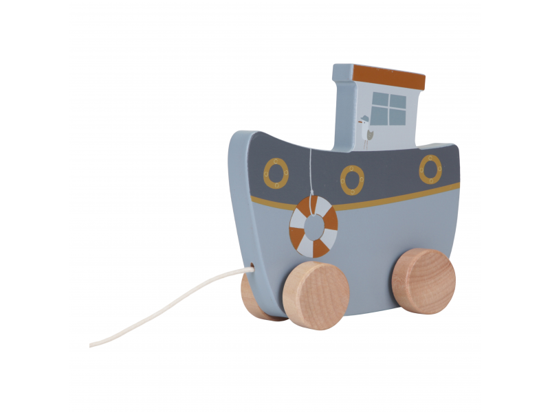 Loďka na kolieskach v krásnom drevenom prevedení má šnúrku, aby ju dieťa mohlo ťahať za sebou.